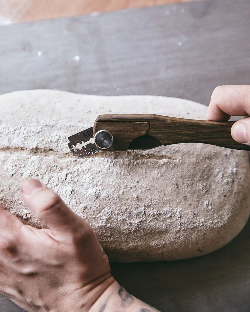 The Bread Lame is an elegant and functional tool designed for sourdough bakers. Handcrafted from sustainable smoked oak wood by artisan Jan Andersen, it features a sharp razor blade for precise scoring and a concealer function in the handle for safe storage. This tool allows you to create beautiful patterns and achieve the perfect oven spring in your bread.